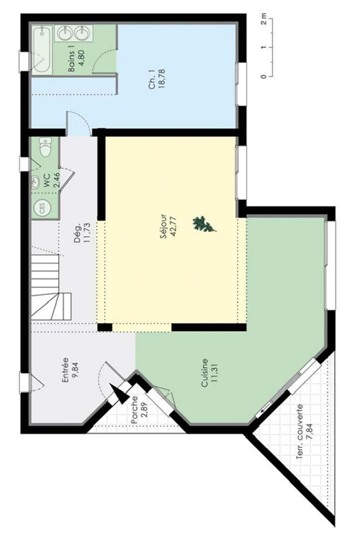 Étage : Ambiance plus ludique pour l’étage, réservé aux enfants. Dans le salon, deux fauteuils en vis‐à‐vis permettent de converser au calme, ou de se plonger dans la lecture d’un livre tiré de la bibliothèque attenante… Le salon pourra se transformer en chambre, si la famille s’agrandit ou dès le début du projet.