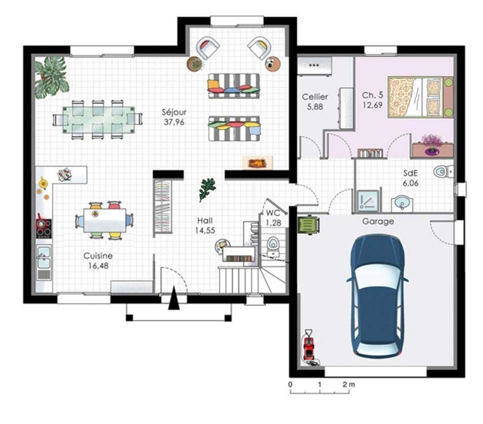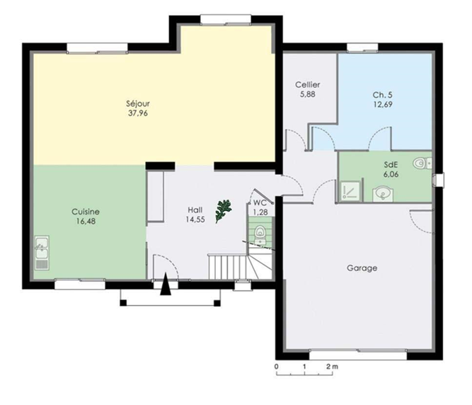 Les espaces imaginés pour simplifier la vie des habitants commencent dès le rez‐de‐ chaussée : ses 98 m² abritent un garage double, un cellier de 5 m², un hall spacieux de 14 m² avec placard ainsi qu’une cuisine ouverte de 16 m².