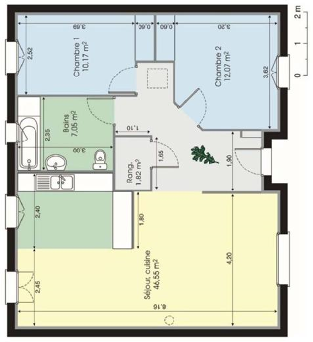 Elle peut s’adjoindre un garage, une terrasse. Cette maison existe en deux autres versions, de 98,95 m² et 113,18 m2, avec respectivement trois et quatre chambres, qui bénéficient d’un cellier ; la configuration des espaces conviviaux reste à peu près la même d’un modèle à l’autre, les chambres s’ajoutant dans la longueur…