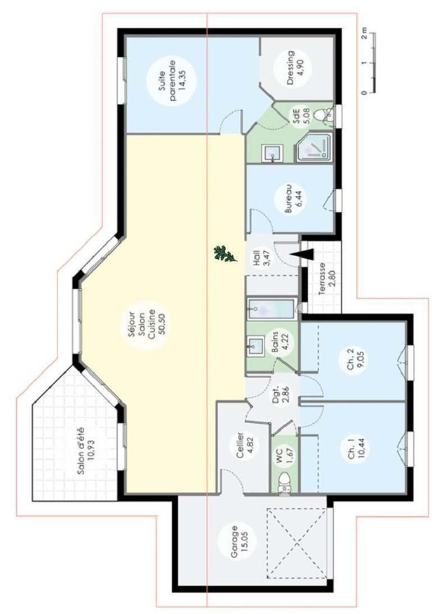 Le cellier, prévu pour Madame, fait la jonction entre garage et maison et permet le transport des courses à l’abri des intempéries ! Séjour, salon, cuisine communiquent entre eux, tout en s’ouvrant largement sur le jardin et sur le salon d’été couvert, par le biais de grandes baies. La maison, toute de plain‐pied, a été conçue sans marches ni escalier afin d’offrir à tous, petits comme Anciens, un lieu de vie d’une grande accessibilité.
