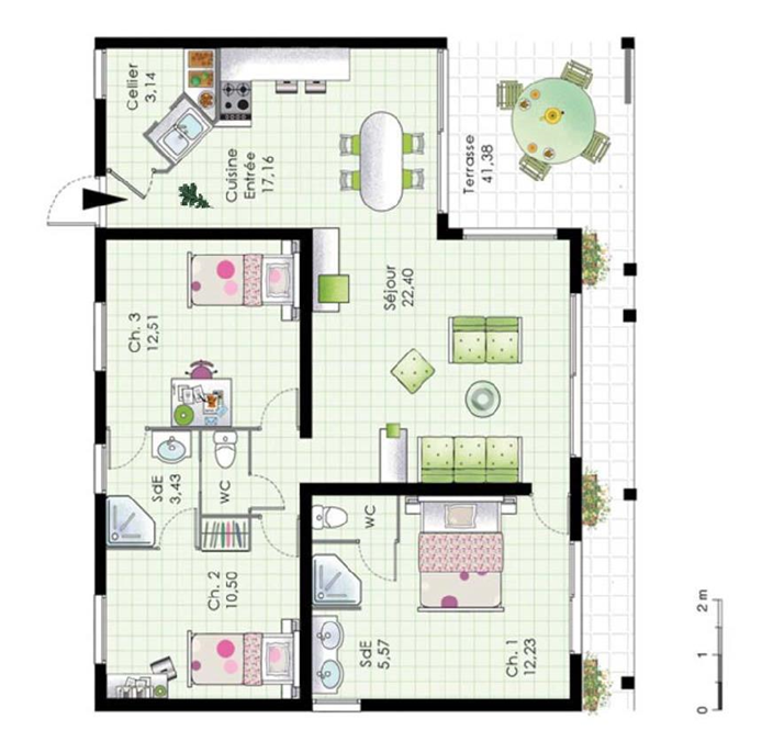 Maison : 74,43 m² ; garage : en option ; terrasse : 41,38 m²